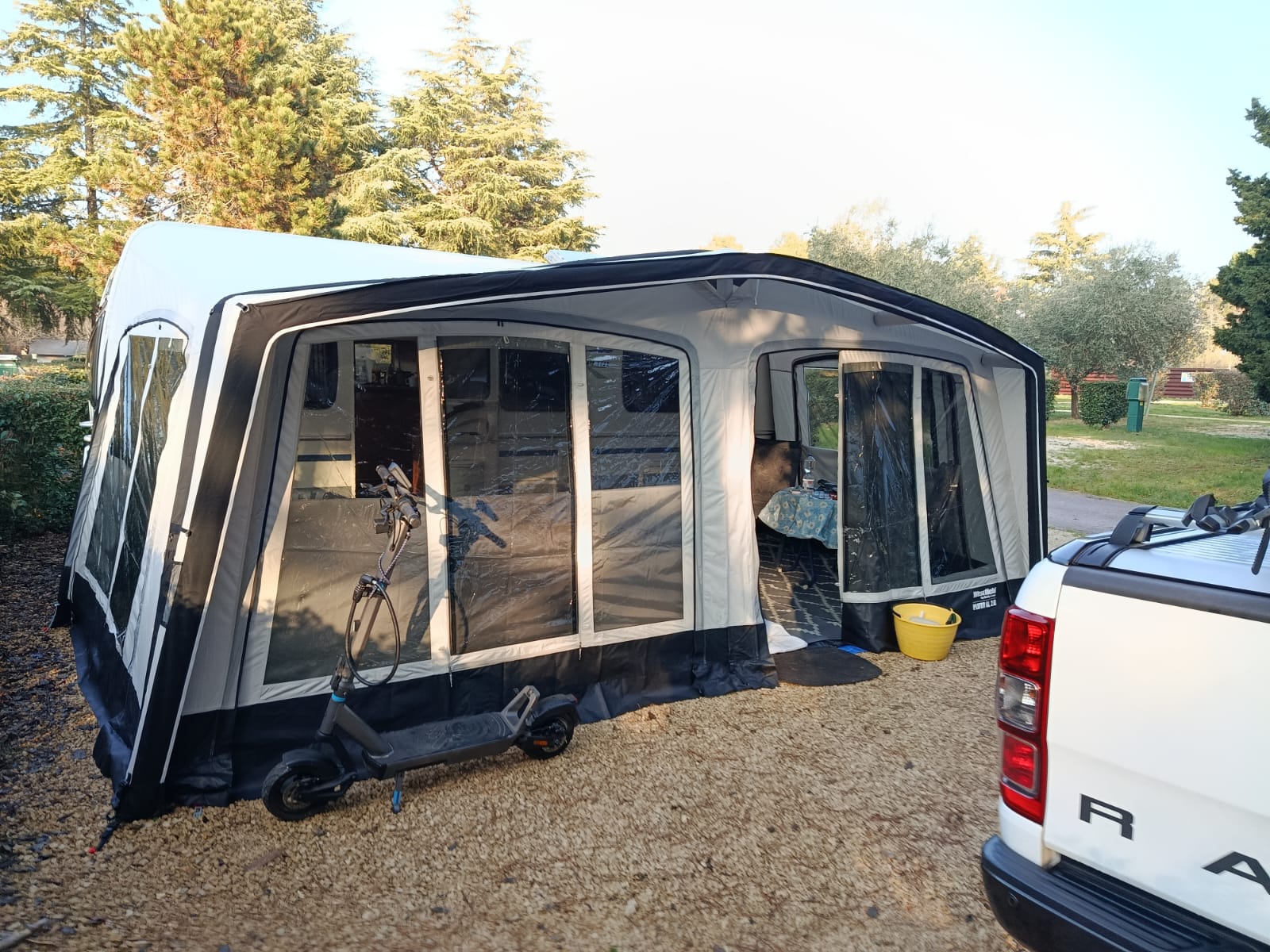 Le Westfield Pluto XL 2.0 en taille 9 est un auvent gonflable extra profond pour caravane d'une circonférence de 981 à 1015 cm qui couvre toute la caravane. Le modèle 2024 (2.0) bénéficie d'un nouveau design. Le toit de l'auvent est désormais circulaire, ce qui lui confère un aspect moderne. Les poteaux en aluminium de la verrière (débord de toit) ont laissé place aux tuyaux d'air. De plus, tous les panneaux amovibles ont la même courbe que le toit et le célèbre matériau CottonTouch est dans une palette de couleurs plus claires, ce qui offre un meilleur contraste avec les accents noirs.