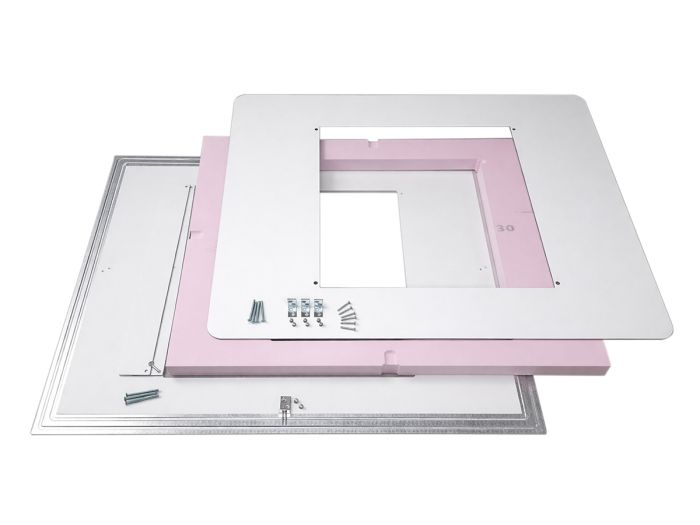 La réduction de découpe de toit en aluminium stable camper-adapter.de 70×50 / 70×40 vers 40×40, incluant l’isolation, une finition intérieure blanche et le matériel de montage, pour l’installation de climatisations de toit, de ventilateurs ou de lanterneaux 40x40 dans des grandes découpes de toit existantes, jusqu’à une dimension maximale de 70x50 cm.