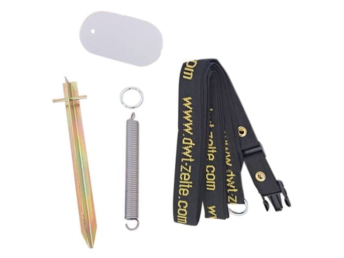 L'ensemble comprend : 2 sangles à œillets, 2 ressorts de décharge, des boucles, une protection anti-frottement et 2 piquets.