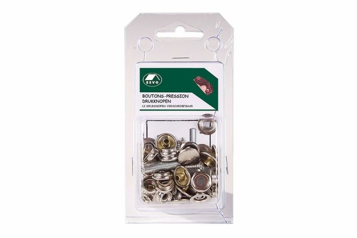 Les boutons poussoirs à vis Esvo vous permettent de fixer vos propres toiles sur une surface dure. Par exemple, un cache-roue sur la caravane. La partie inférieure des boutons poussoirs peut facilement être vissé sur la surface à l’aide des vis fournies. La partie supérieure peut être facilement fixée à une toile ou une bâche à l’aide des outils fournis.