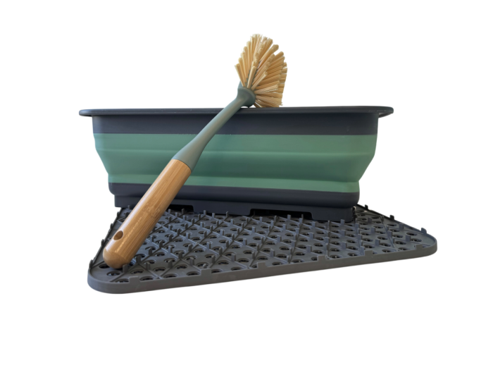 L’ensemble comprend une bassine pliable de 8 litres avec poignées, une brosse à vaisselle en bambou et un tapis d’égouttage en silicone 29,5 x 26 cm.