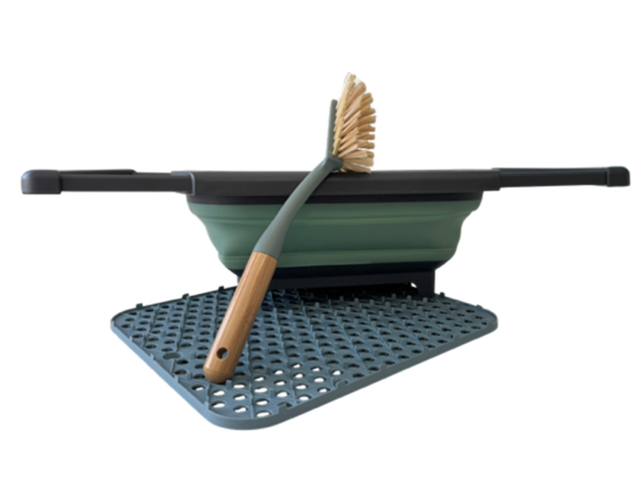 L’ensemble comprend une bassine pliable de 8 litres avec bouchon intégré et poignées, une brosse à vaisselle en bambou et un tapis d’égouttage en silicone bleu de 29,5 x 26 cm.