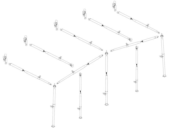 L'armature a un diamètre de 32 mm et est pourvue de 5 mâts et de 5 barres de toit. Les supports F-link vous permettent de fixer l’armature de la solette à l’armature de votre auvent Isabella ou Ventura.