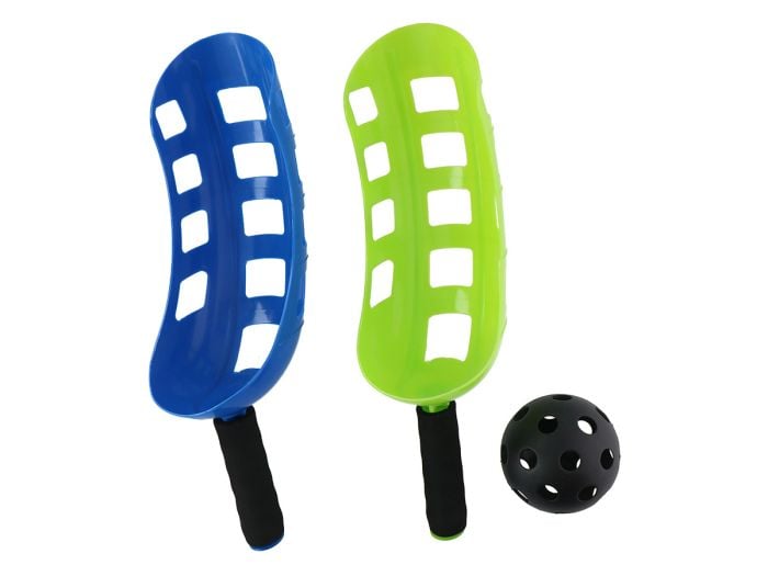 L'ensemble se compose de deux raquettes en plastique et d'une balle.
