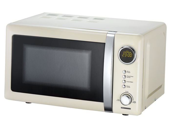 Ce four à micro-ondes électronique est conçu avec un joli design rétro. Le four à micro-ondes est équipé d'une minuterie de 60 minutes et d'un programme de décongélation, ce qui permet de préparer les aliments surgelés en moins de temps. D'une puissance de 700 W et d'une capacité de 20 L, il est parfait pour les petites cuisines grâce à sa taille compacte. Il dispose de 5 programmes et d'un écran LED facile à lire, ce qui le rend extrêmement convivial. Que vous ayez simplement besoin de réchauffer le café, le dîner ou de faire éclater du pop-corn, il sera votre parfait petit assistant.Vos avantages :Four à micro-ondes électroniqueVolume : 20 LPuissance du four à micro-ondes : 700 watts5 niveaux de puissance60 min de cuissonProgramme de décongélationPlateau tournant en verre 245 mmPorte à poignéeAffichage LEDContenu de l'emballage :Four à micro-ondesplateau tournant en verreanneaux du plateau tournantmanuel + instructions de sécurité DK / SE / NO / FI / UK / DESpécifications :Marque : MelissaDimensions : 25,6 x 45,1 x 32,7 cm 25,6 x 45,1 x 32,7 cmCapacité : 20LCouleur : CrèmePoids : 10,1 kgAlimentation électrique : 230VEffet : 700 WLongueur du cordon : 85 cm