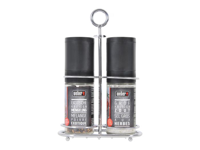 Vous pouvez assaisonner n'importe quel plat avec du sel et du poivre. Ces moulins à épices Weber sont livrés dans un support pratique pour que vous puissiez facilement les placer sur la table. Cet ensemble de 2 pièces se compose d'un moulin à épices au gros sel aromatisé au romarin et d'un moulin à épices avec un mélange d'épices exotiques. Ingrédients du moulin à sel :