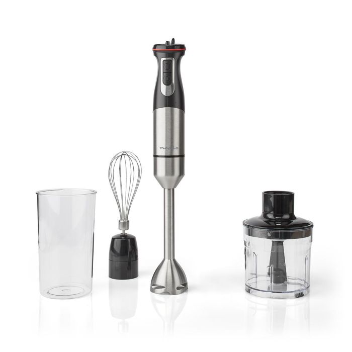 Grâce à sa finition moderne en acier inoxydable, ce mixeur plongeant s'adapte à tous les décors de cuisines. Complétez votre batterie de cuisine avec cet ensemble blender 4-en-1 compact mais complet. Il inclut un mixeur plongeant, un hachoir pour préparer notamment du riz de chou-fleur, un fouet pour mélanger le lait pour un cappuccino ou des œufs pour une omelette, et un bol pratique pour mélanger ou verser votre délicieux mélange. Mixer et mélanger des soupes, des sauces et des smoothies n'a jamais été aussi pratique. Ce blender est plus rapide, plus pratique et nécessite moins de nettoyage et de lavage qu'un blender sur pied. Équipé d'un arbre et d'une lame en acier inoxydable, il dispose de multiples modes de vitesse pour mixer les légumes et fruits les plus durs.Nous voulons que vous puissiez mixer rapidement et facilement, avec contrôle. C'est la raison pour laquelle ce blender est doté de vitesses variables, d'une fonction Turbo et de lames en acier inoxydable ultra-aiguisées qui coupent presque tout. Tout cela est possible grâce au moteur de 800 W contrôlable d'une simple pression. Cet Ensemble blender 4-en-1 Nedis comprend un bol généreux de 900 ML. Mélangez directement dans le bol grâce au mixeur plongeant et obtenez immédiatement la bonne quantité d'ingrédients. Le hachoir de 500 ML est idéal pour hacher finement des oignons, des noix et du chou-fleur, tandis que le mixeur plongeant est parfait pour préparer des soupes, des jus pour bébés et des smoothies onctueux.Tous les accessoires de ce kit passent au lave-vaisselle, mais sont également faciles à nettoyer à l'eau chaude avec un peu de détergent. Si vous utilisez le mixeur plongeant tous les jours, nous vous conseillons vivement de détacher le pied et de le laver à la main pour qu'il reste comme neuf.