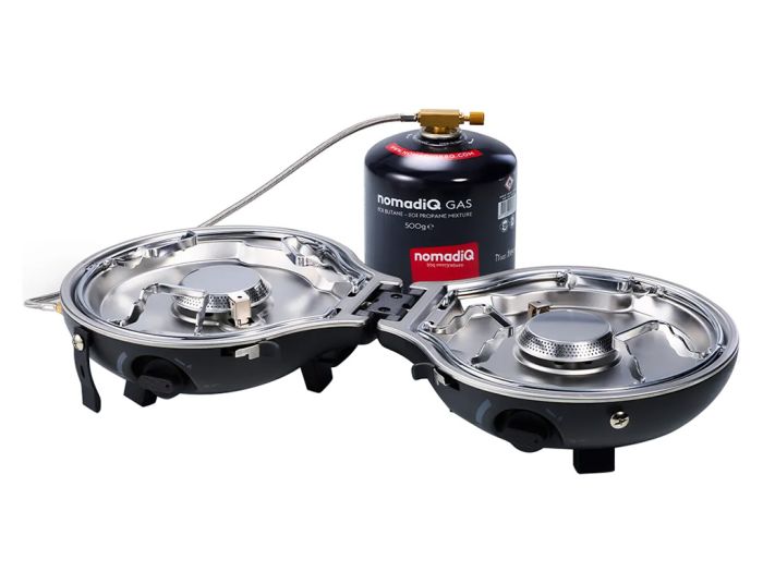 Le réchaud est livré dans une boîte recyclable, accompagné d’un tuyau de gaz et d’un manuel d’utilisation. Seule une cartouche de gaz (connexion à vis) est nécessaire. Le réchaud nomadiQ intelligent est équipé de deux brûleurs très puissants (peu sensibles au vent) avec deux régulateurs de température indépendants, et il est facile à nettoyer après usage.