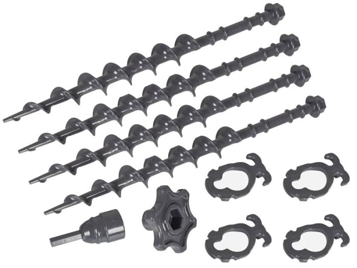 Ce lot comprend 4 piquets à vis Obelink ABS, 4 anneaux de fixation pour un élastique de tente ou une corde, un adaptateur pour la visseuse et une poignée pour l’adaptateur lorsque vous n’avez pas de visseuse sous la main. Cela vous permet également de visser manuellement les piquets à vis dans le sol.