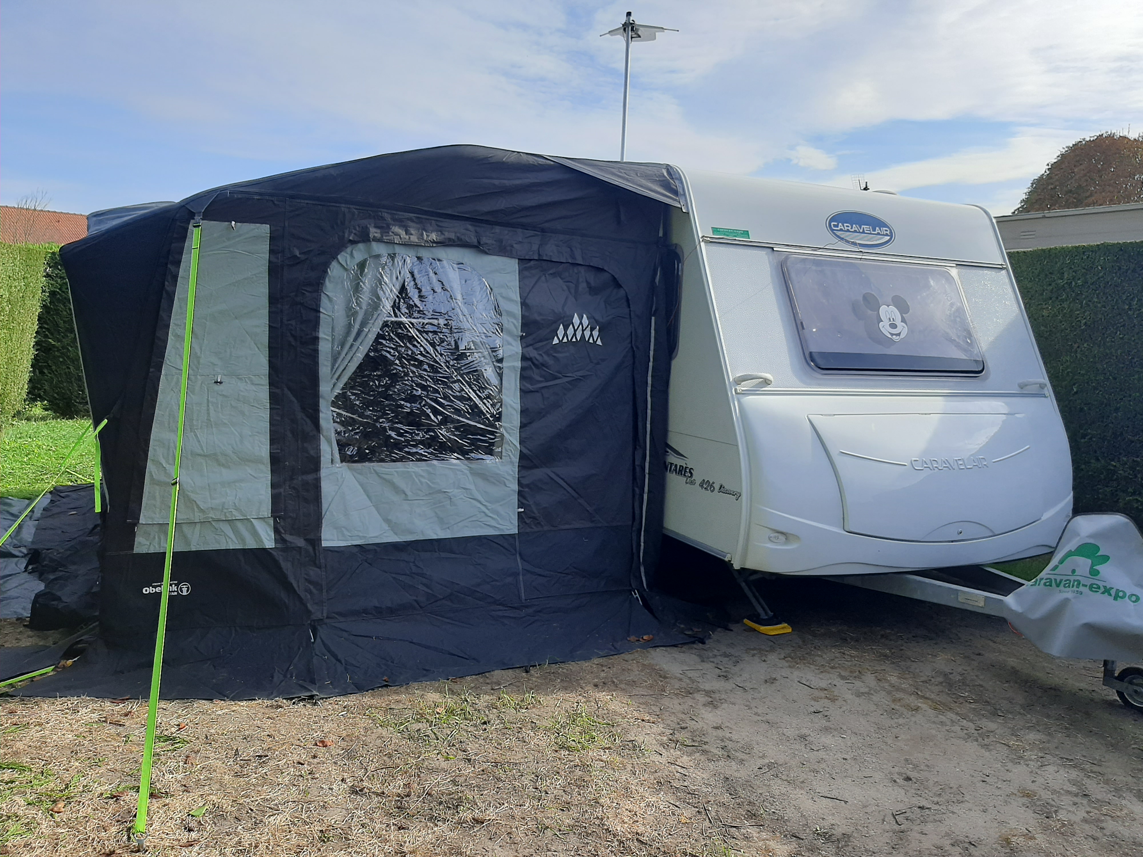 Dans l'Obelink Atrium 390 Easy Air Connected, les deux parois latérales et tous les panneaux de porte peuvent être entièrement retirés. Par beau temps, tu peux transformer l'auvent en store en retirant tous les panneaux. Selon l'emplacement de ta caravane ou de ton camping-car, tu peux choisir quelle porte utiliser comme entrée principale.
