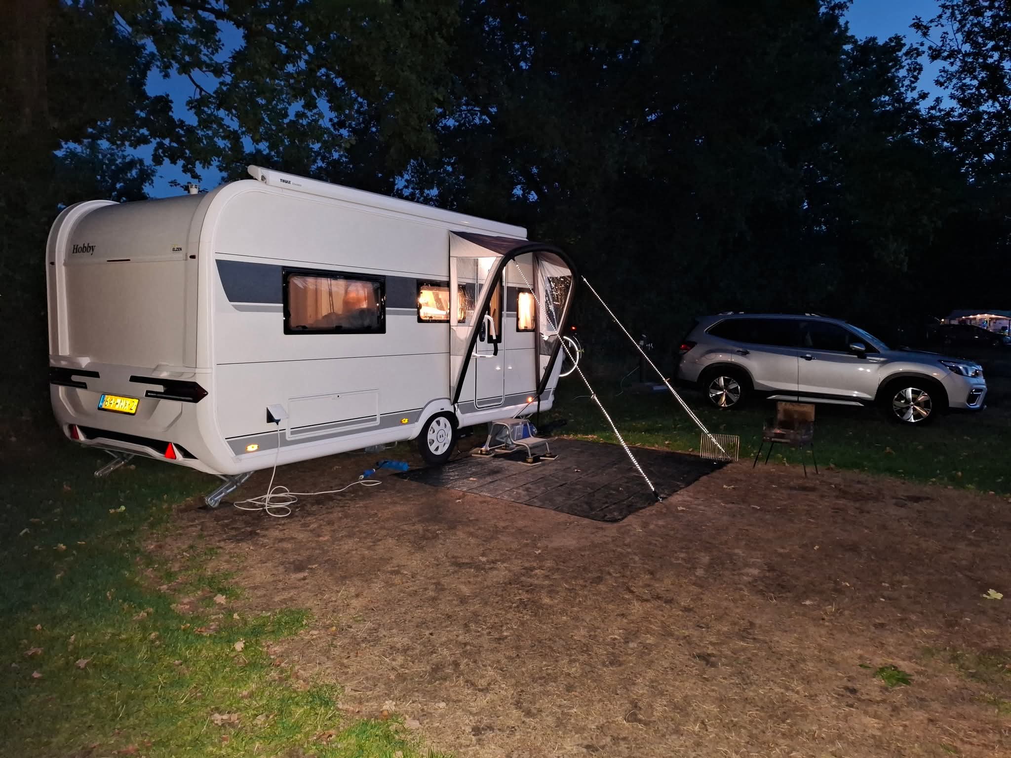 Un auvent de porte sur la caravane vous permet d'ouvrir la porte de la caravane pour la ventilation sans que la pluie ne pénètre à l'intérieur. Un auvent de porte offre également de l'intimité et ajoute juste ce petit plus au sentiment de camping lorsque vous partez avec la caravane sans auvent complet. Dans les deux parois latérales, il y a un compartiment de rangement pratique pour vos Crocs ou chaussures. Ainsi, vous pouvez entrer dans la caravane avec les pieds propres et secs.