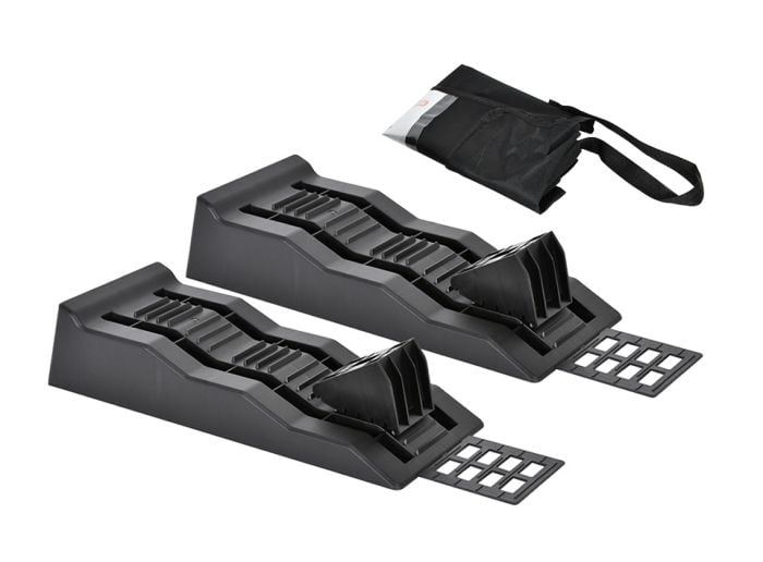 Ce kit vous permet de stabiliser votre véhicule à trois hauteurs différentes : 4, 7 et 10 cm, pour un parfait alignement sur tout type de terrain. Il se compose de deux rampes de nivellement (Level Up Wedges), deux cales de blocage (Chock Levels), deux plaques antidérapantes (Anti-Slip Plates) et d’un sac de rangement pratique pour un transport facile.