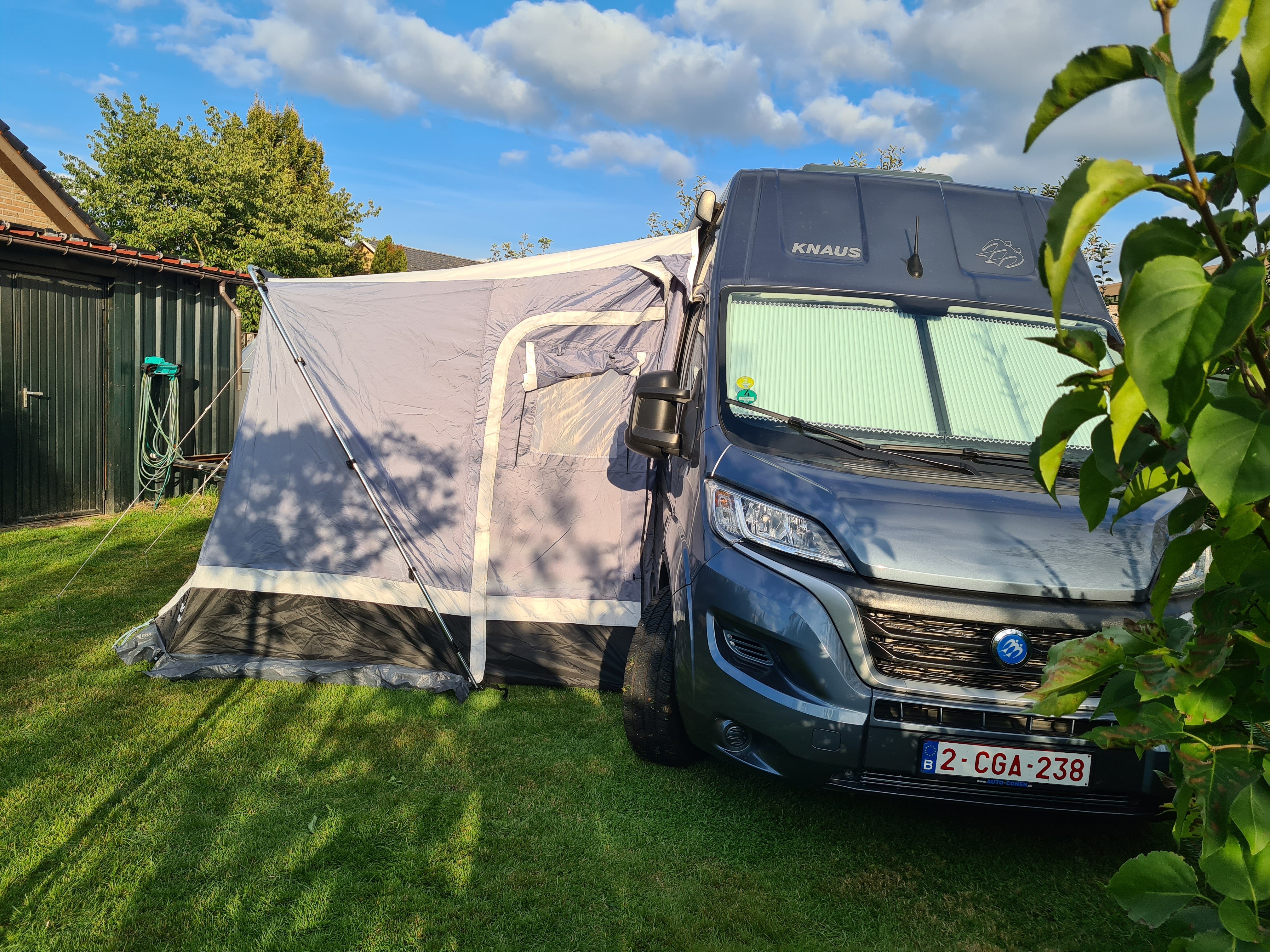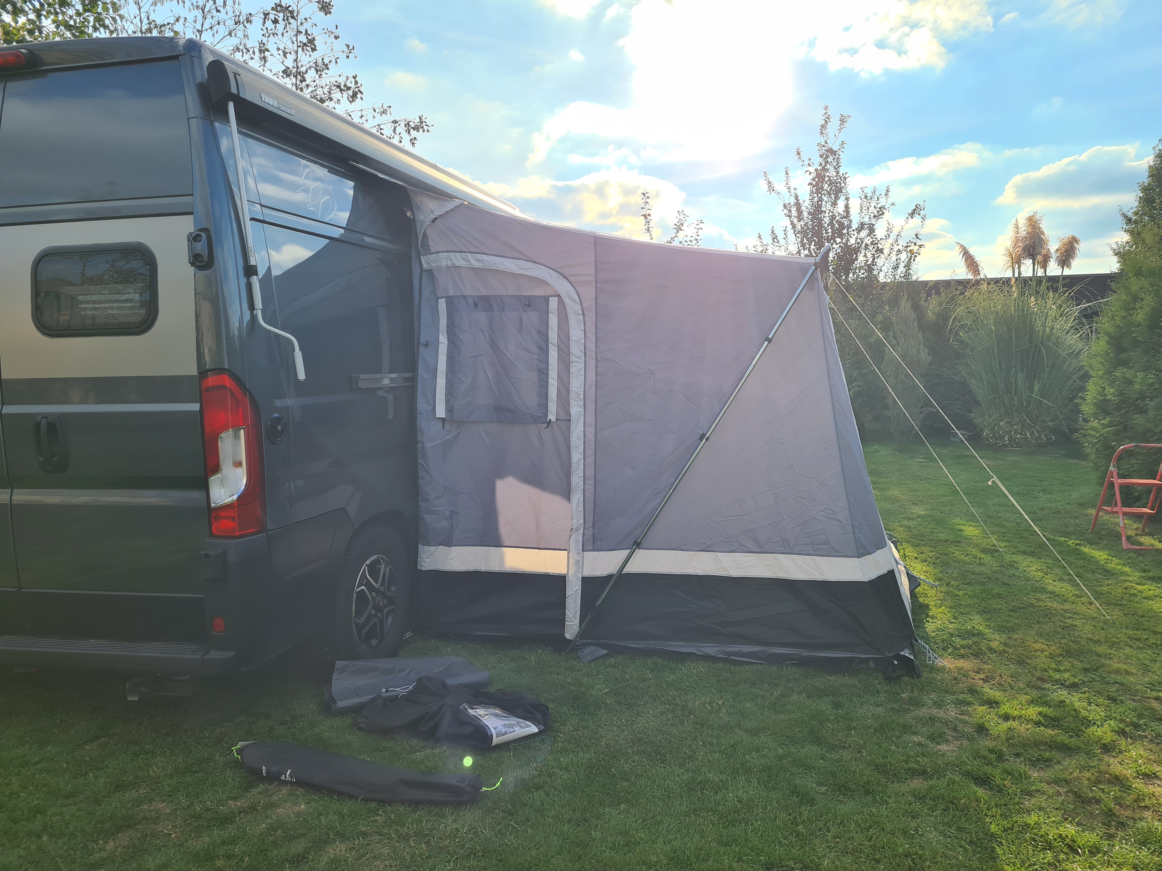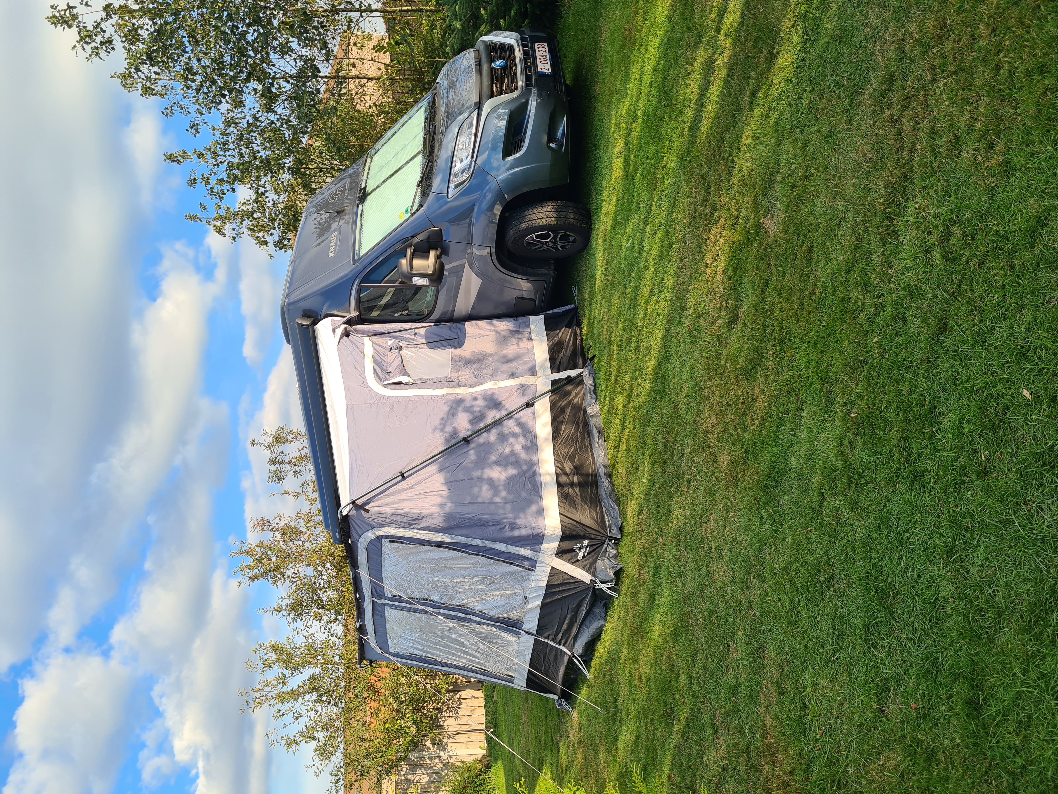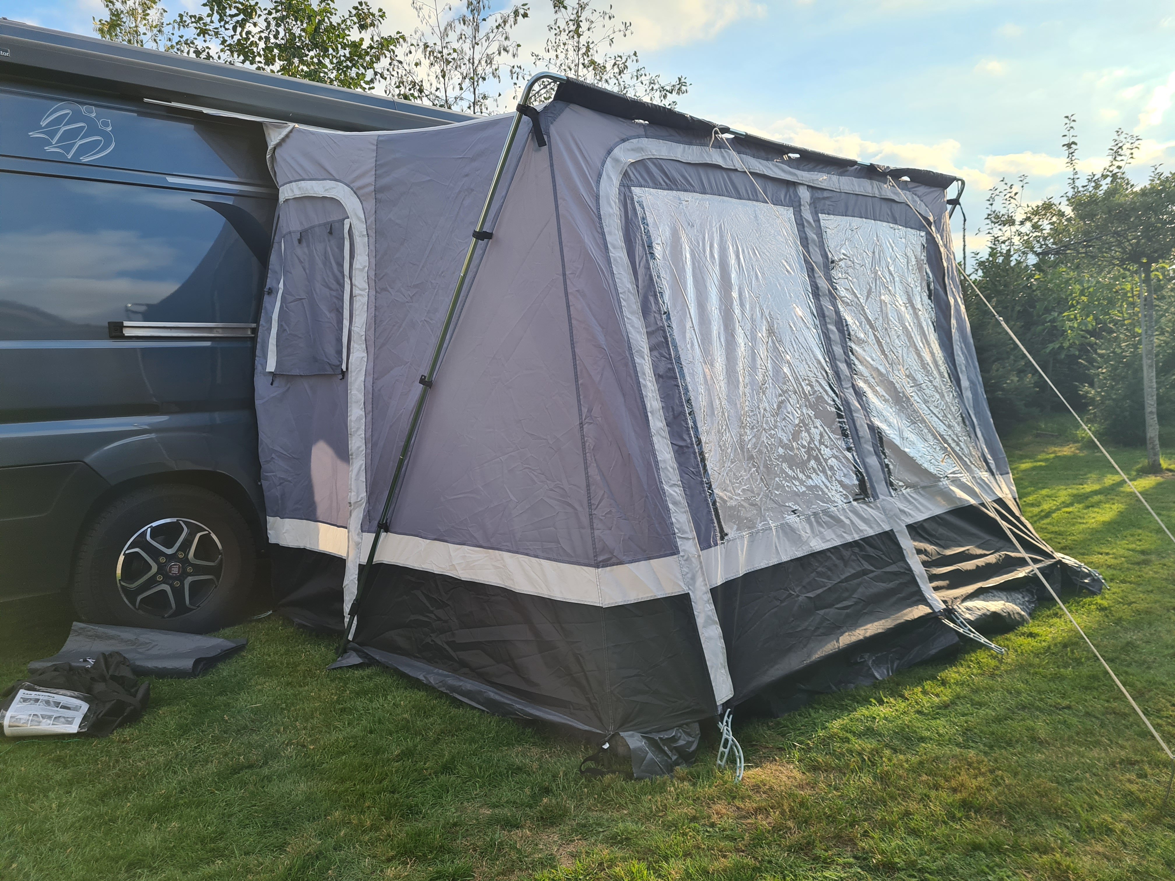 Les cordes, les piquets, le tapis de sol, la jupe, le cache-roue et le sac de rangement sont livrés avec l’auvent. Des coussins en mousse sont cousus sur cet auvent pour une bonne connexion avec la paroi de la caravane. Vous pouvez les fixer avec des sardines afin d’éviter des courants d’air.