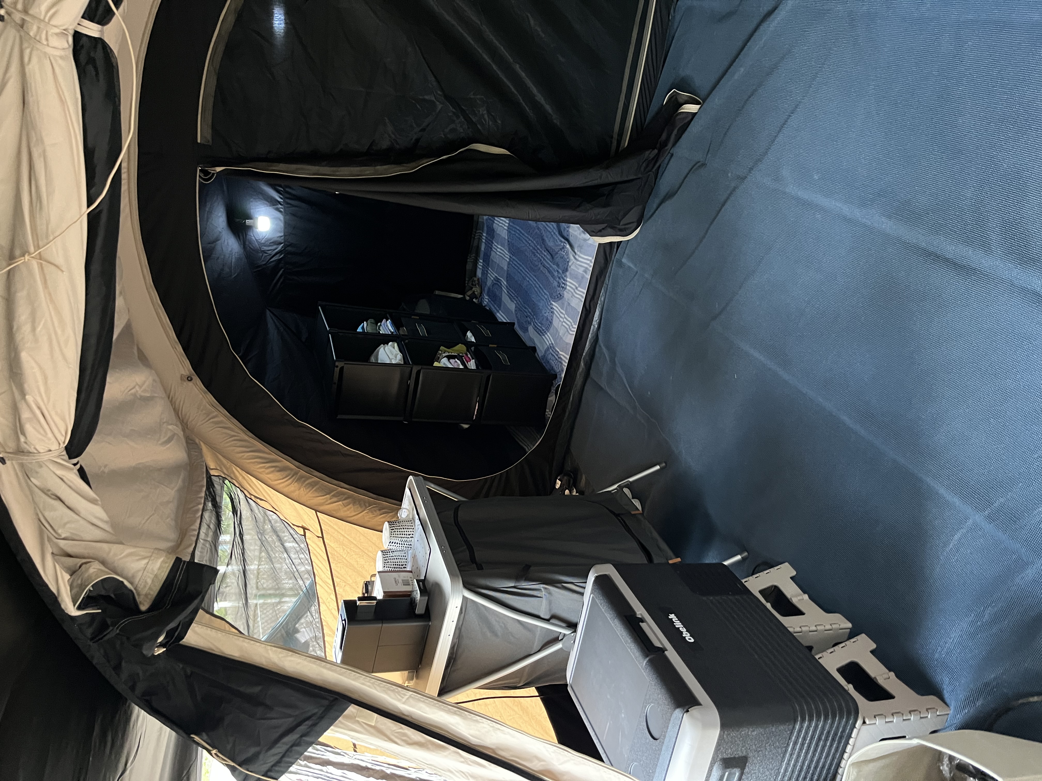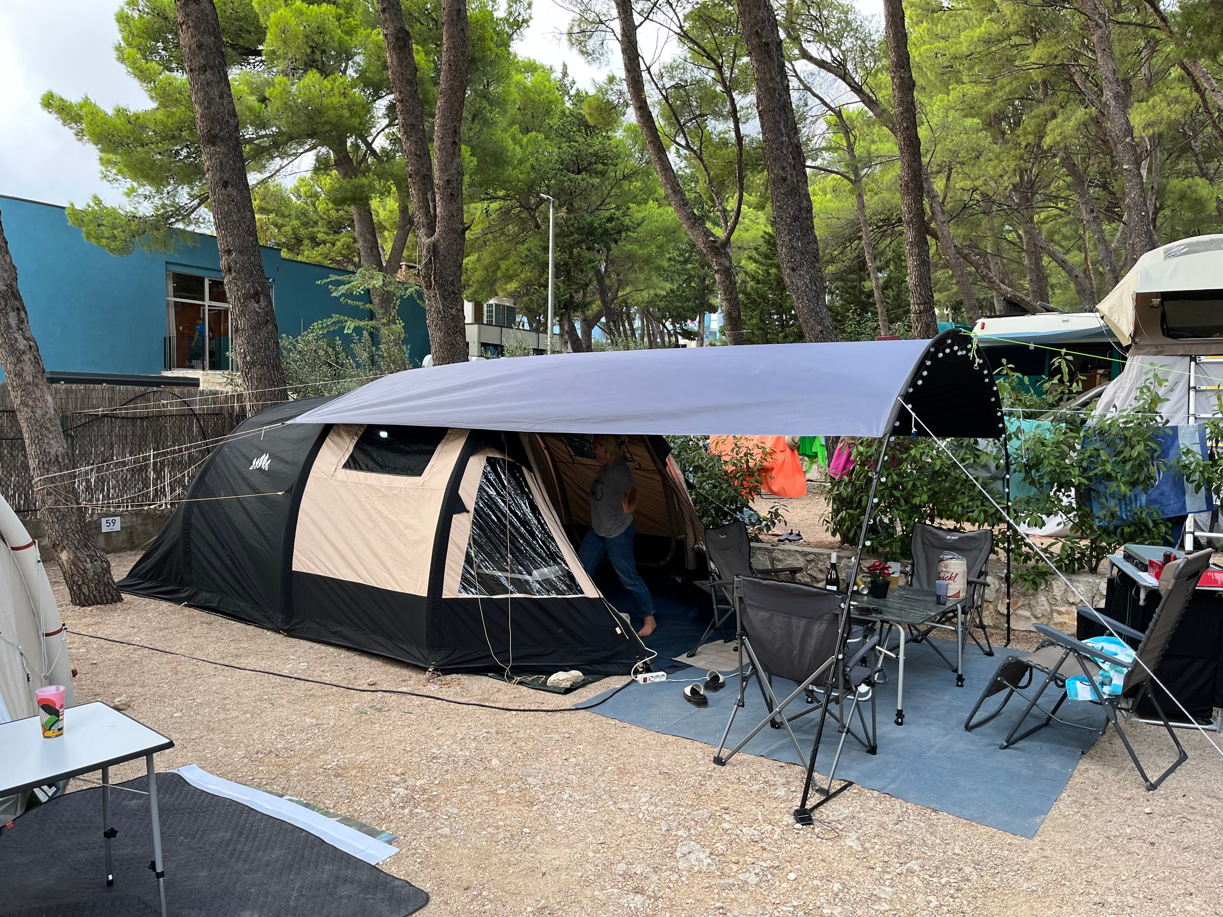 - Mooie tent!Tent is makkelijk op te zetten. Slaapcabines zijn mooi donker. Grootte is perfect voor 3 personen. Enige nadeel is dat aan de onderkant voorzijde tent deze niet sluit met rits maar met klittenband. Bij flinke regen/ storm houdt het regen en misschien wind niet helemaal buiten. Daarnaast is het jammer dat er geen bijpassende luifel is.