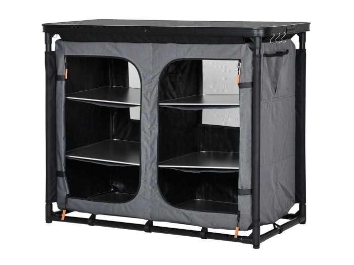 Vous recherchez une cuisine de camping qui vous permettra de cuisiner confortablement tout en offrant un grand espace de rangement pour vos affaires ? L’armoire Obelink Toulon Luxe - Black est parfaite pour vous ! Avec ses 6 compartiments de rangement spacieux et son plateau en aluminium, cette armoire est un meuble de cuisine très pratique. Son plateau résistant à la chaleur et à l'eau en fait un plan de travail idéal.