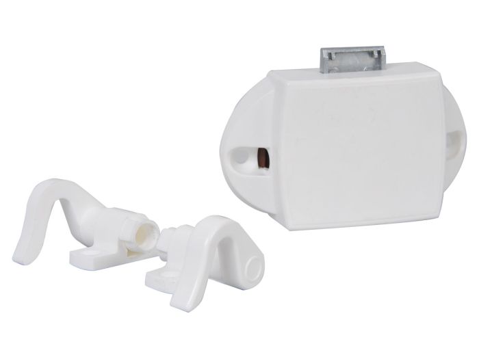 Le verrou espagnolette White à bouton poussoir avec crochets de verrouillage est pratique pour votre caravane, camping-car ou bateau.