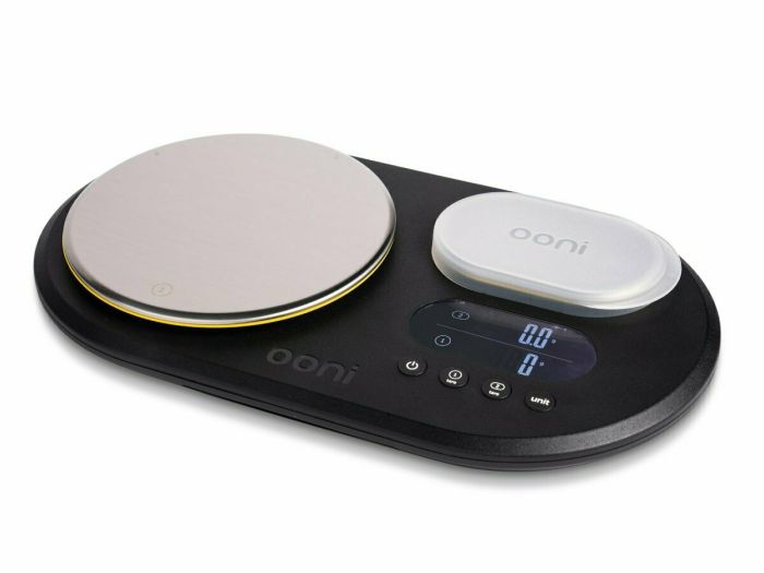 La balance à double plateforme Ooni est le choix idéal pour mesurer avec précision les ingrédients lors de la préparation de pizzas.