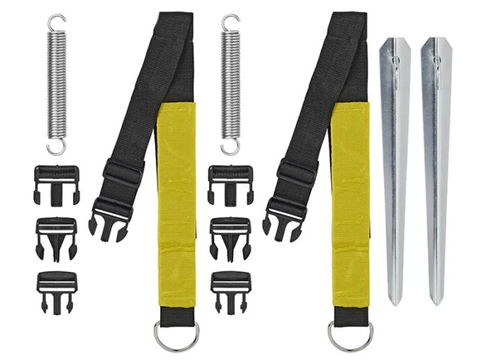 Ce kit se compose de deux sangles de tension robustes en nylon, particulièrement visibles grâce à leur couleur jaune, de 2 ressorts pour sangles anti-tempête, de 2 piquets robustes pour sangles anti-tempête ainsi que de 2x 4 boucles différentes.