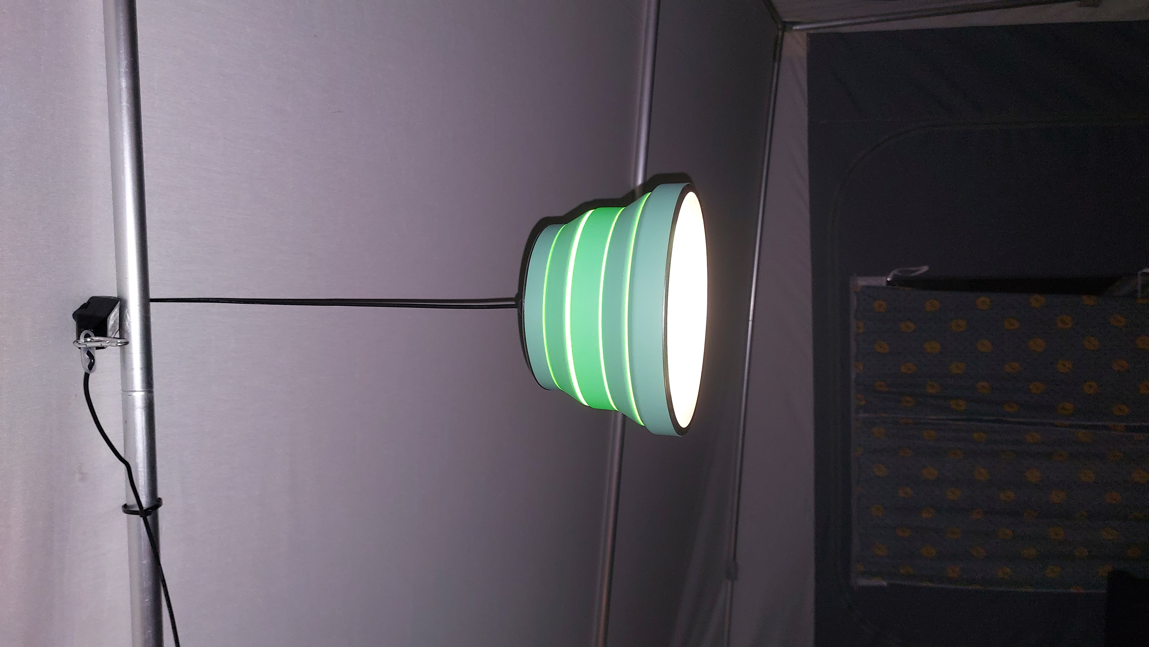 La lampe peut être pliée en trois modèles différents, de complètement plat à déplié comme un véritable abat-jour. Elle est dotée d'un câble de 5 mètres et peut être facilement suspendue à la hauteur souhaitée grâce à un mousqueton. L'intensité lumineuse est réglable en continu avec l'interrupteur sur le câble, juste au-dessus de la lampe.