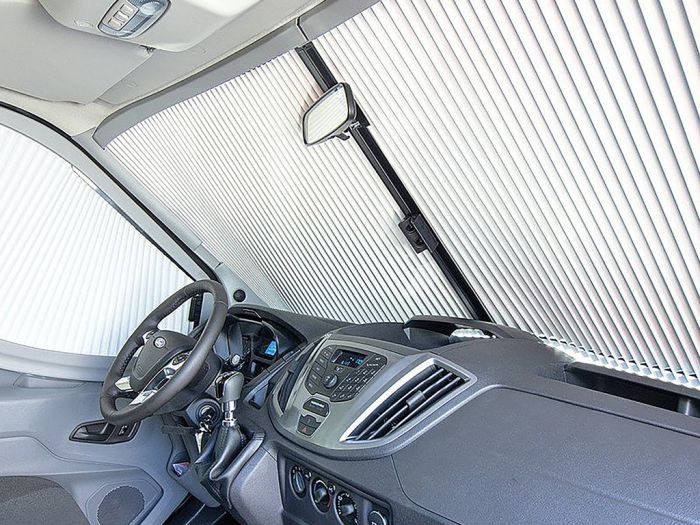 Le Remis Remifront IV convient aux Ford Transit (modèle V363) construit à partir de 2019. Pour un système occultant complet, utilisez également les côtés latéraux disponibles séparément. De cette façon, la cabine est complètement protégée de l'extérieur. Le système Remifront est facile à intégrer et s'adapte complètement à l'intérieur. Le rideau plissé et le cadre sont de couleur gris.