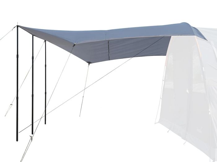 Sa forme spéciale lui permet de s'adapter parfaitement à l'entrée de nombreux modèles de tentes. Le bord arrière est simplement posé en chevauchant légèrement la tente et tendu vers l'arrière. Les trois tiges télescopiques fournies, réglables progressivement (jusqu'à 210 cm de hauteur), soutiennent le bord avant et créent un auvent spacieux.