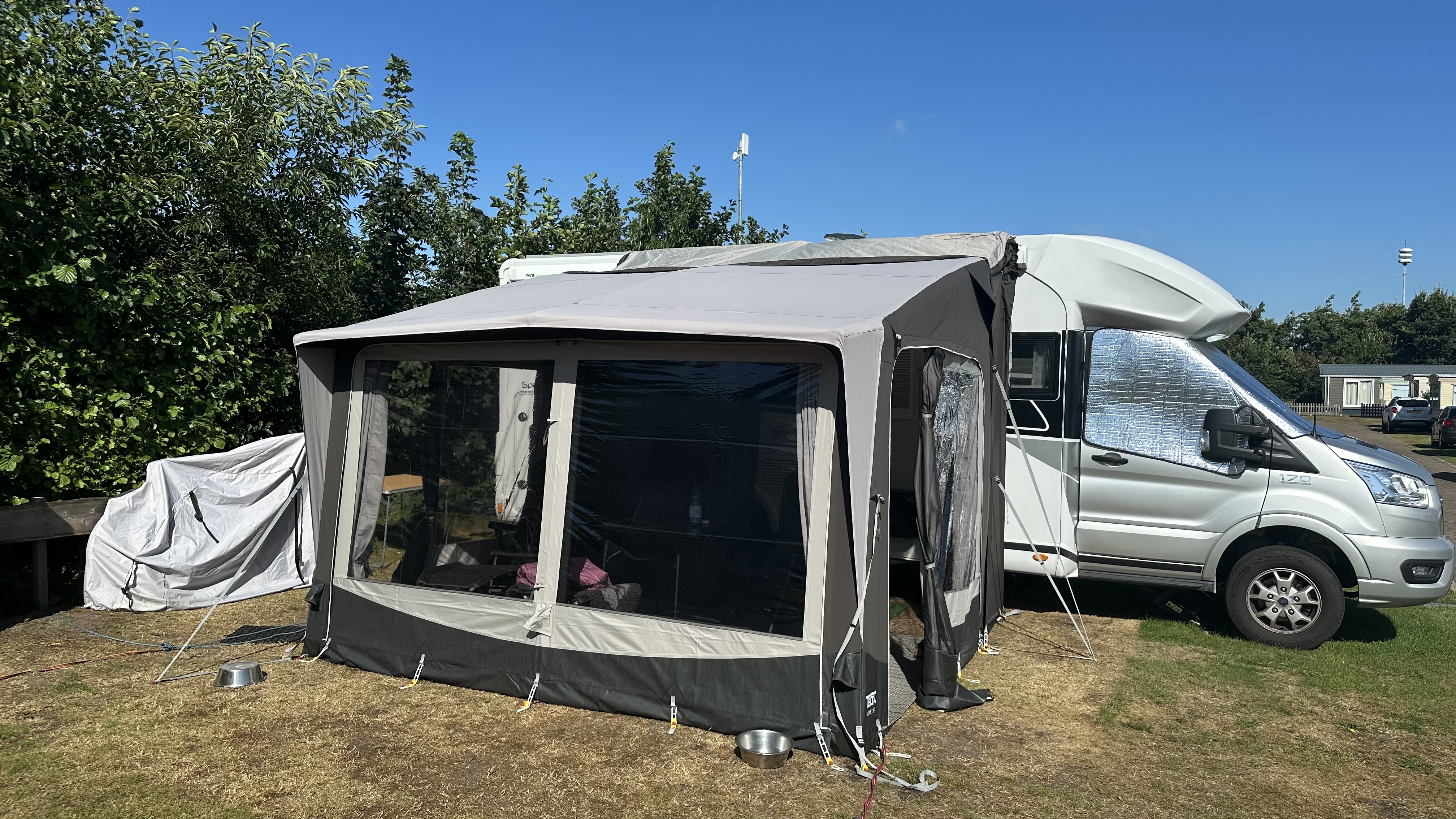 Cet auvent pour camping-car convient aux fourgons et aux camping-cars normaux grâce à ses rabats disponibles séparément.