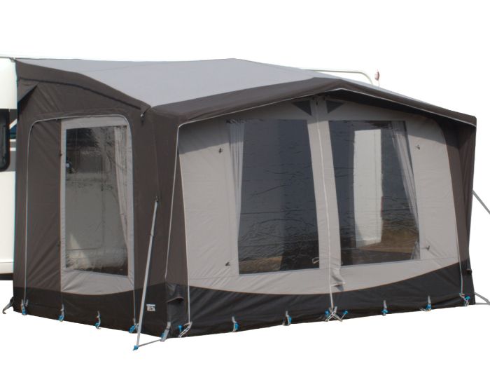 La série Life de Telta comprend des auvents faciles d'utilisation et accessibles qui, grâce à leur casquette, offrent un look traditionnel et convivial. Malgré un design épuré et d'apparence simple, chaque détail a été soigneusement pensé. Par exemple, tous les panneaux sont entièrement amovibles grâce à la fermeture à glissière, permettant de transformer l'auvent en solette en un clin d'œil lors de belles journées d'été. Grâce à sa hauteur généreuse à l'avant, cet auvent offre une hauteur sous plafond suffisante partout. Ainsi, les panneaux bénéficient d’une hauteur d’environ 187 cm, ce qui permet d’entrer dans l’auvent sans avoir à se baisser. Les grandes fenêtres teintées laissent entrer la lumière naturelle abondante tout en préservant l'intimité. Pour une intimité totale, toutes les fenêtres peuvent être habillées à l'intérieur avec les rideaux fournis.