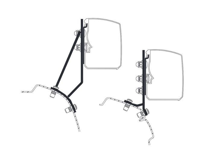 L'adaptateur Thule 3200 Custom V710/Transporter T7 permet la fixation d’un store Thule Omnistor 3200 d'une longueur de 270 ou 300 cm sur une Volkswagen T7 ou une Ford Transit Custom V710. Ce kit d'adaptateurs se compose de deux étriers.