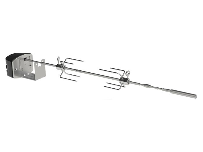 Presque tout a meilleur goût après avoir été rôti au feu jusqu'à ce que ce soit croustillant : le filet de porc, le poulet entier et même les côtes de bœuf. Le tournebroche est équipé d'une broche en acier inoxydable, de deux fourchettes qui peuvent maintenir en place les petits et les grands morceaux d'aliments, d'une poignée, d’ustensiles et d'un moteur électrique qui fait lentement tourner les aliments au-dessus de la grille.Le mécanisme de rotation offre un repas juteux et cuit uniformément.